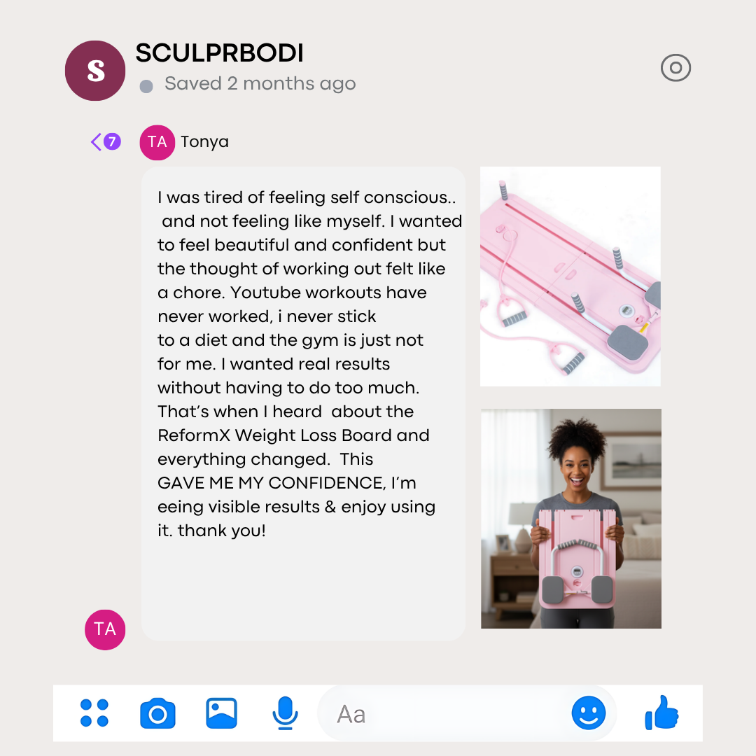 ReformX™ helps tone and sculpt your core, glutes, thighs, arms, and back. It’s a full-body system that focuses on the areas most women want to tighten and lift — especially the waist and lower body.